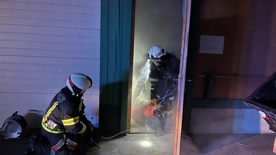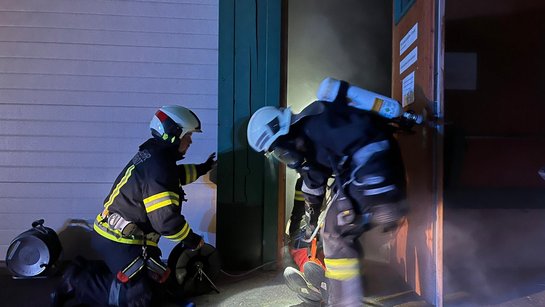 Bei so gut wie keinen Sichtverhältnissen mussten die Atemschutzträger eine vermisste Person im oberen Geschoss des Firmengebäudes ausfindig machen und diese dann mit dem Tragetuch ins freie retten. Ein weiterer Trupp wurde in Folge dessen mit der Brandbekämpfung mit einem HD Rohr beauftragt. Auch hier forderte es, auf Grund der schlechten Sichtverhältnisse wegen der starken Verrauchung, viel Schweiß, den Brandherd ausfindig zu machen und diesen abzulöschen.